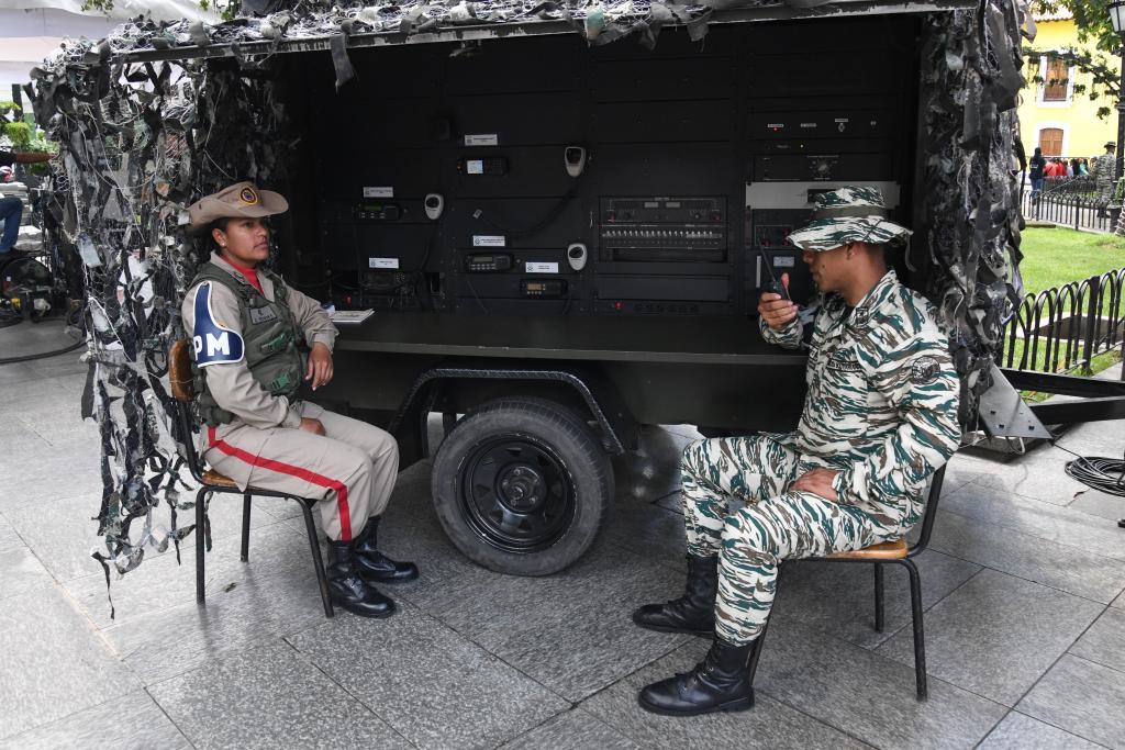 10月4日,在委内瑞拉首都加拉加斯的玻利瓦尔广场,玻利瓦尔民兵组织成员操作通信设备。新华社发(马科斯·萨尔加多摄)
