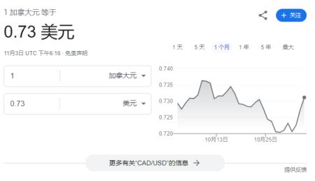 不过今天根据谷歌财经的数据,目前加元对美元的汇率已经回升至1加元=0.73美元。