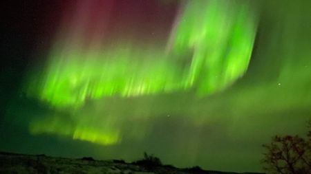 11月5日,加拿大安省出现一场令人眼花缭乱的北极光盛宴,安省夜空被欧洲和北美大部分地区的北极光照亮。远至维珍尼亚州(Virginia)以南的天文观测者,在G3级太阳风暴中欣赏到北极光的景色。太阳的日冕物质抛射将带电粒子发射到地球的高层大气中,与电离气体结合,从而形成发光的极光。