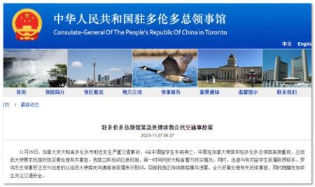 1月26日下午,中国驻多伦多总领馆发布信息,称加拿大安大略省多伦多市附近发生严重交通事故,4名中国留学生车祸身亡。中国驻加拿大使馆和驻多伦多总领馆高度重视,丛培武大使要求积极妥善处理有关事宜。多伦多总领馆立即启动应急机制,第一时间向安大略省警方核实情况。同时,迅速与有关留学生家属取得联系,罗伟东总领事受正在外出差的丛培武大使委托向遇难者家属表示慰问。