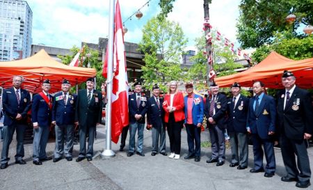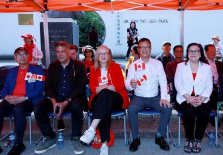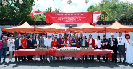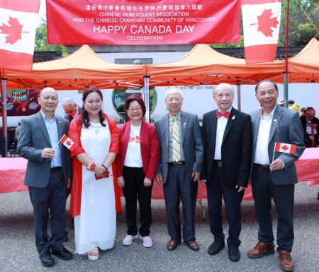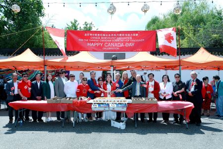 (本网讯)为庆祝加拿大建国157周年,温哥华中华会馆联合华社各界于7月1日(Canada Day)上午在华埠中山公园广场举办了隆重的国庆升旗暨庆祝仪式。本地政界、华社和民众数百人欢聚一堂,共庆加拿大157 周年生日。加拿大联邦枢密院终身院士黄陈小萍、BC省就业、经济发展及创新厅长贝雅丽(Brenda Bailey)、BC省公民事务省务厅长周炯华、BC省议员李耀华、温哥华副市长费必得(Pete Fry)、香港驻加西首席代表袁黄洁玲等政要出席了升旗活动,并与社区领袖和各界嘉宾共同切蛋糕和金猪,庆祝加拿大生日。