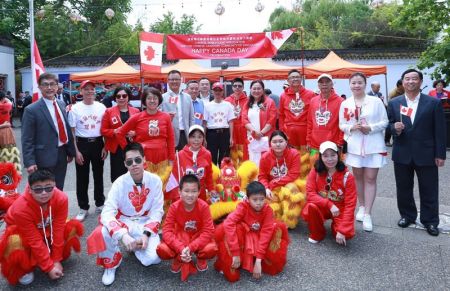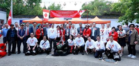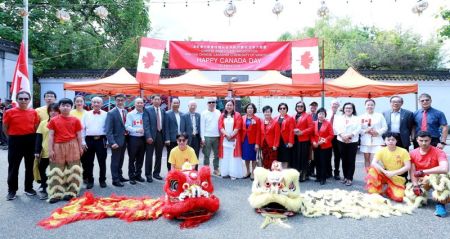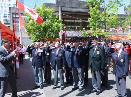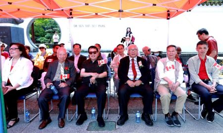 当天晴空万里,中山公园广场环绕着上百面加拿大国旗和中式灯笼,到处喜气洋洋。中午12点,伴随喜庆欢快的鼓点,十来个色彩鲜艳、身手矫健的雄狮在人群中欢腾跳跃,热闹的场面,拉开华埠加拿大日庆祝活动序幕。接着,加拿大海陆空退伍军人280分会代表在庄严的加拿大国歌声中升起加拿大国旗。现场许多嘉宾和民众都身着与国旗一致的红白两色服饰,或手持小国旗以表庆祝。