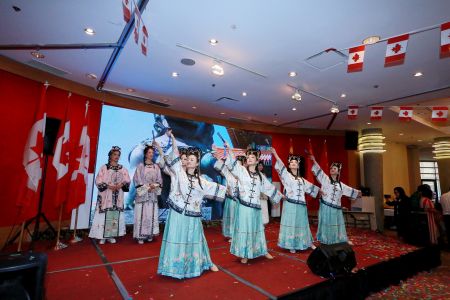 嘉宾们共同登台举杯祝酒,庆祝加拿大建国157周年!晚宴上不仅有各种各样精美佳肴,现场还有丰富多彩的文艺节目。