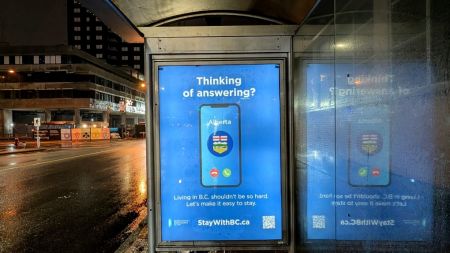 琼斯说,虽然「留在BC」活动「并没有找到阻止人口流动的所有答案」,但它有可能激发正在考虑搬迁者之间的对话。这些广告的设计看起来像来自阿省的手机来电或视讯邀请,其中的讯息提示读者重新考虑接听或「向右滑动」(swiping right)——这是在约会应用程式上接受某人的术语。