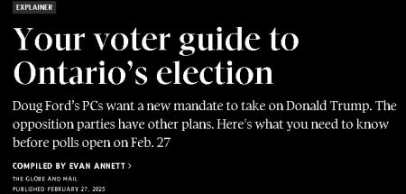 选举结果预计在2月27日晚9:00之后陆续公布。过半数(63席)即可组成多数政府,而保守党解散时持有79席。选举结果或决定安省未来数年在贸易战中的走向。(据51网、Globe and Mail)