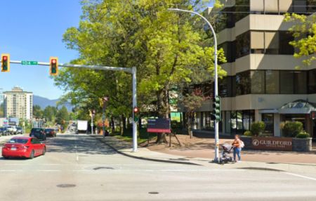 CBC分析了2019年至2023年的ICBC数据,发现素里市发生行人车祸最多的路口大多位于繁华的第72大道(72 Avenue)沿线,该路段有许多繁忙的购物中心。然而,涉及行人车祸最多的路口,是吉尔福德社区(Guildford)的104大道(104 Avenue)夹152街(152 Street)(上图),在2019年至2023年间共发生23起车祸。