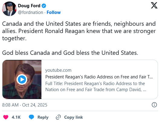 特朗普周四晚些时候表示,他将关闭与加拿大的贸易谈判,原因正是这些广告。这些广告引用了罗纳德·里根(Ronald Reagan)的一段旧电台讲话,其中谈到了关税的弊端。