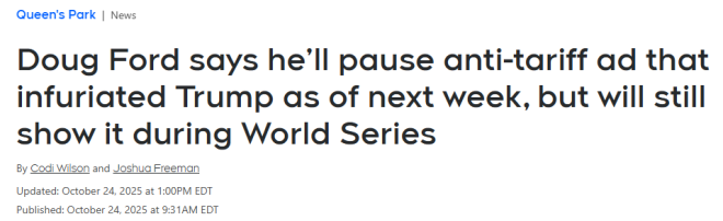 安大略省省长福特(Doug Ford)表示,由于美国总统特朗普(Donald Trump)因安省的广告而中断了与加拿大的贸易谈判,该省将从周一开始“暂停”在美国播放的反关税广告宣传活动,以便贸易谈判可以恢复。