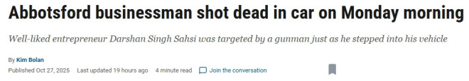 加拿大BC省阿伯茨福(Abbotsford)本周一(10月27日)早上发生一起致命枪击案,68岁的印度裔企业家萨西(Darshan Singh Sahsi) 在自家门外被枪杀,案件震惊社区。