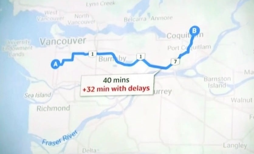 第5位:BC省温哥华桑那斯区至高贵林:畅通时行程约需40分钟,繁忙时份多32分钟,原因是整个温哥华都常有阻塞情况。