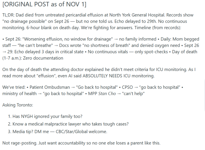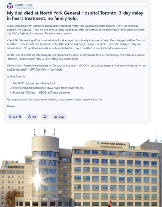 近日一位华人网友在Reddit论坛发帖说:我爸在北约克全科医院(North York General Hospital)因未治疗的心包积液去世。病历显示9月26日写着“积液恶化,无引流窗口”——但没人告诉家属。超声心动图延迟到29日才做。而且没有连续监测。死亡当天有6小时完全没有记录。我们正在努力寻求答案。
