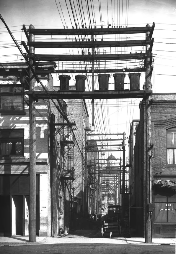 这些木结构设施最早于大约80年前,也就是上世纪50年代安装,包括盖士镇(Gastown)、华埠,以及市中心的其他地区。这些架空基础设施支撑著狭窄巷道内的高压线路和变压器,如今使用这些巷道空间的是窗户、消防通道和其他基础设施。最明显的变化之一发生在2023年,当时卑诗水电公司的工作人员拆除了耶鲁镇的60多根木制电线杆。