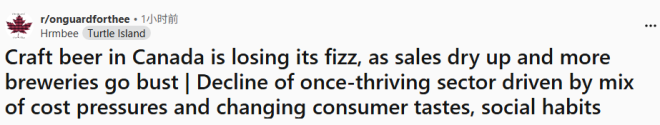代表酿酒企业的行业组织Beer Canada也承认,酒厂数量在2024年略有缩减,并表示近五年来啤酒销量每年下降约2%。不仅是精酿酒厂,大型啤酒商同样面临需求放缓。