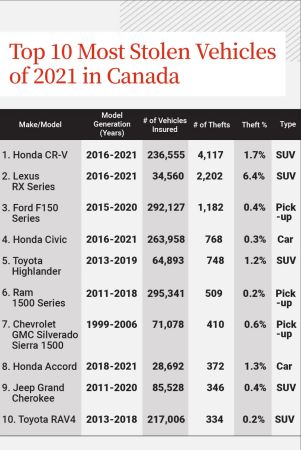 据正在调查盗窃案上升的Équité Association称,受影响的车型包括本田CR-V,这是加拿大最常被盗的车型;以及雷克萨斯RX系列、福特F-150和本田思域。“这是一场全国性的危机,”Équité调查服务副总裁Bryan Gastl告诉环球新闻,“到2023年,前六个月的情况比2022年更糟糕。”