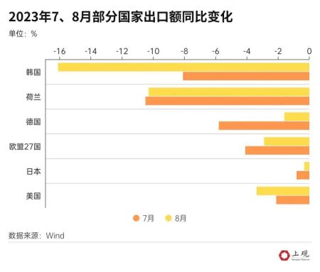 美国、德国、荷兰、日本、韩国、法国,这些都是2022年全球出口金额前十的国家,但在7、8月出口的同比增幅几乎都是负值。例如,美国出口金额在今年4月进入同比负增长;韩国出口更是已连续12个月负增长,今年9月同比减少4.4%。欧盟的情况也不容乐观。其27国的商品贸易出口额同比增幅在7月进入负增长,荷兰负增长趋势尚未出现拐点。