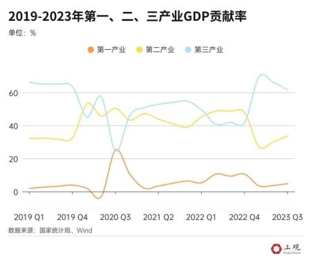 服务业经济运行总体延续恢复性增长态势,主要经济指标改善。前三季度,服务业增加值同比增长2.3%,比上半年加快0.5个百分点;服务业生产指数同比增长0.1%,其中三季度同比增长1.2%,比二季度上升4.5个百分点。得益于今年的旅游盛况,今年一、二季度交通运输、仓储和邮政业、住宿和餐饮业相比2022年第四季度,贡献率均由负转正。批发和零售业、租赁和商务服务业的贡献率相比去年也有较大提升,甚至超过2019年同期。此外,第一产业贡献率略高于2019年,第二产业则与2019年几乎持平。