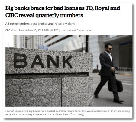 周四,加拿大三大银行公布了季度财报,与本周早些时候丰业银行(Scotiabank)的情况一样,它们都预留了更多的资金以应对可能出现的贷款坏账。皇家银行(RBC)、道明银行(TD)和加拿大帝国商业银行(CIBC)在周四股市开盘前向投资者披露了它们的财务状况,尽管这三家银行仍然保持着很高的盈利水平,但它们都显示出为弥补不良贷款而预留的资金数额急剧上升,这是银行业密切关注的一项指标,被称为信贷损失准备金。