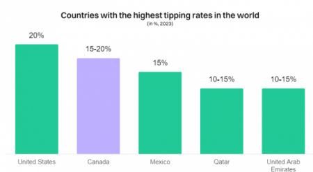 加拿大自 2023 年 4 月以来,各省最低工资大约在 16.65 加元左右。尽管如此,加拿大的小费率仍然位居第二,在 15% 到 20% 之间。墨西哥是第三大给小费慷慨国(15%),卡达和阿拉伯联合大公国的小费率约为帐单的 10% 至 15%。