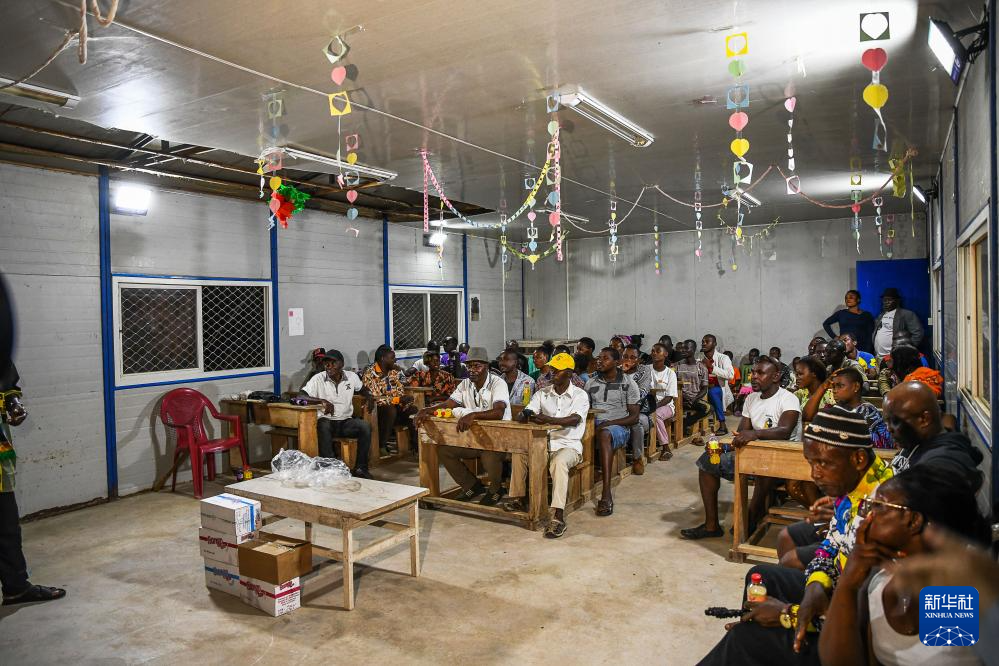 夜幕降临,恩杜马莱村的村民聚集在学校广场上举行活动。广场周围是中国港湾通过社会责任活动“点亮克里比”为村里架起的太阳能照明灯,村民们在灯光下载歌载舞,欢声笑语回荡在夜空中。