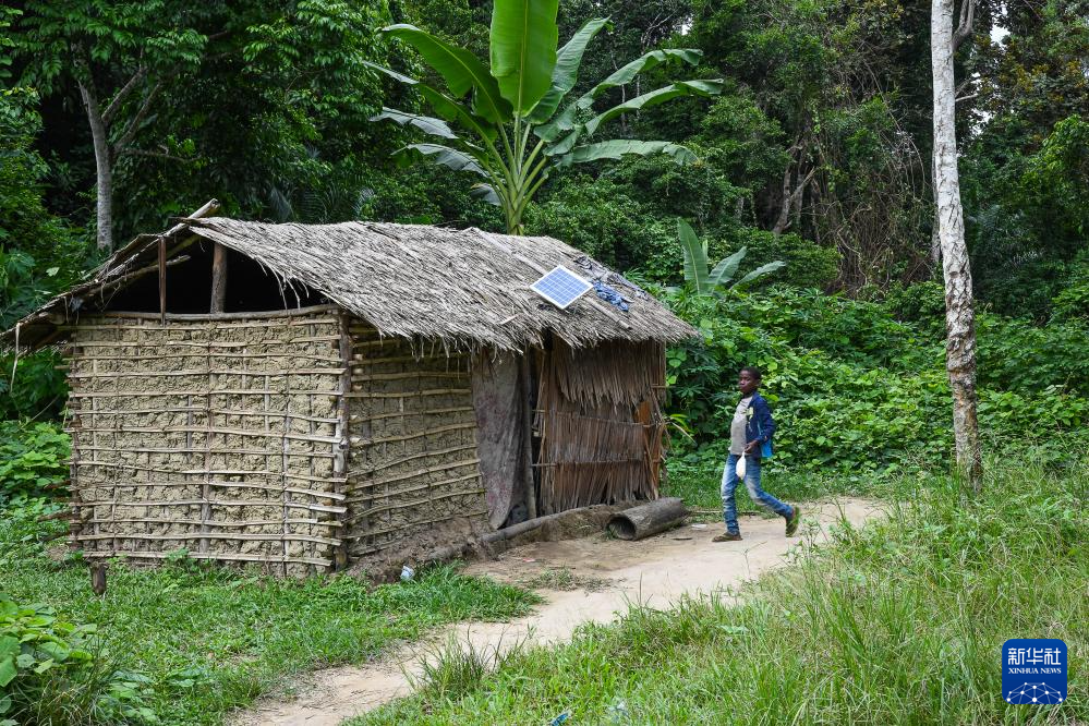 这是7月11日在喀麦隆南部大区克里比市恩杜马莱村的俾格米人房屋,中国企业为这间房子安装了太阳能灯。新华社发(科普索摄)