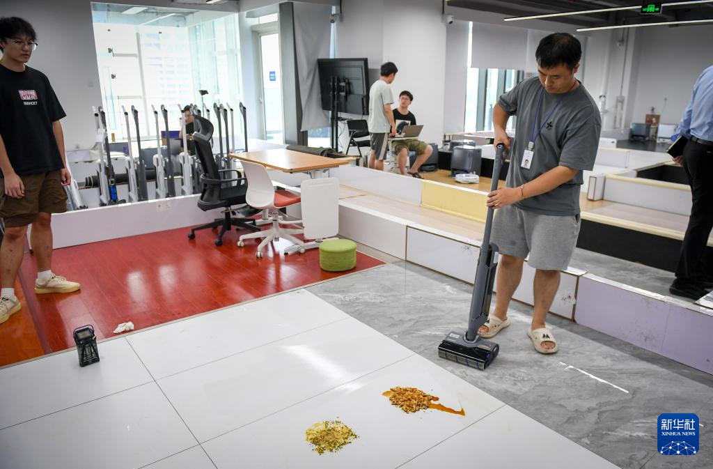 2024年8月20日,在位于深圳云鲸总部的功能测试实验室,工作人员测试云鲸智能洗地机的性能。新华社记者 毛思倩 摄