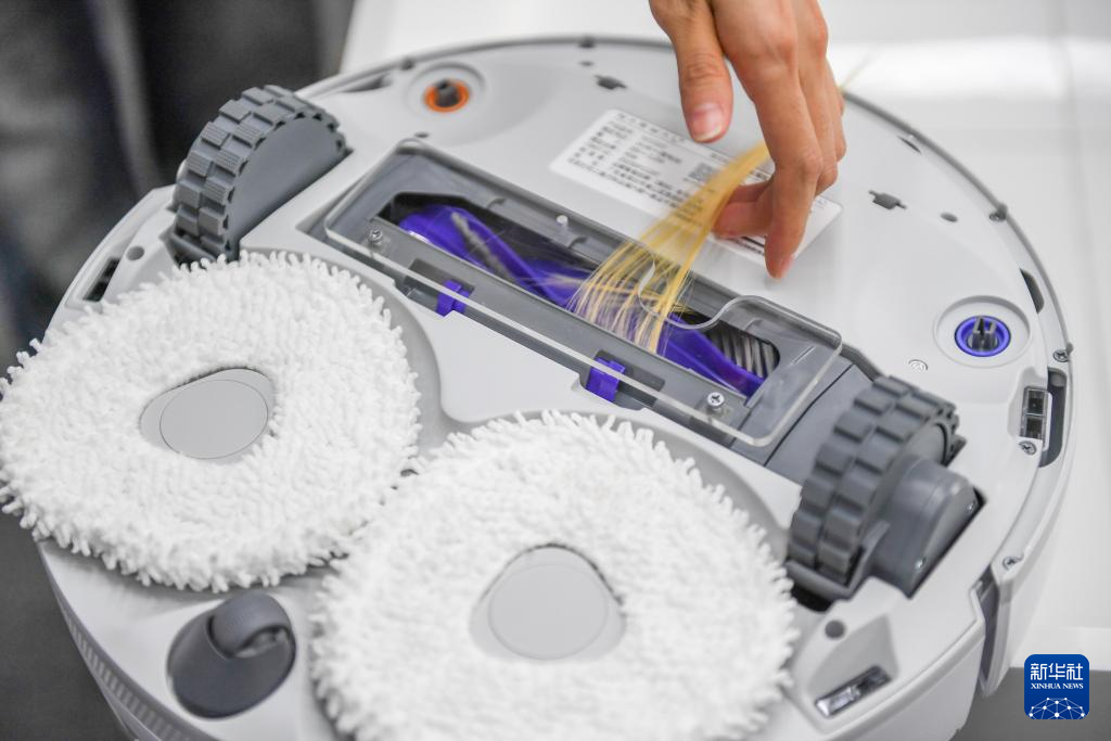 2024年8月20日,在位于深圳的云鲸总部,工作人员展示新款扫拖机器人J5的防缠绕功能。新华社记者 毛思倩 摄