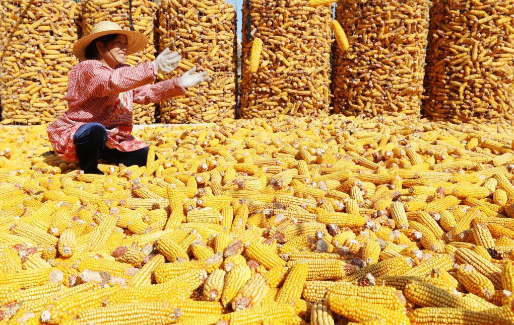 9月22日,山东省临沂市郯城县郯城街道农民整理收获的玉米。新华社发(张春雷摄)