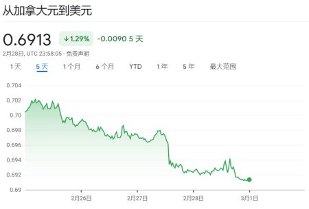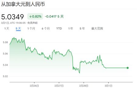 美国总统特朗普本周确认,将按原计划从3月4日(下周二)起正式对加拿大商品征收关税,彻底消除了市场对关税生效时间的疑虑,并打破了此前市场对可能延期的希望。关税威胁重燃,导致加元本周跌至3周低点,兑美元汇率一度触及1.4425大关(即69美分),达到自2月4日以来的最低水平。与此同时,加元兑人民币进一步跌至5.03,也是最近3周来的最低水平。