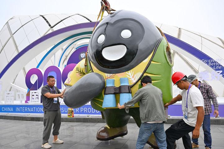 4月10日,工作人员在摆放消博会吉祥物。 新华社记者 郭程 摄