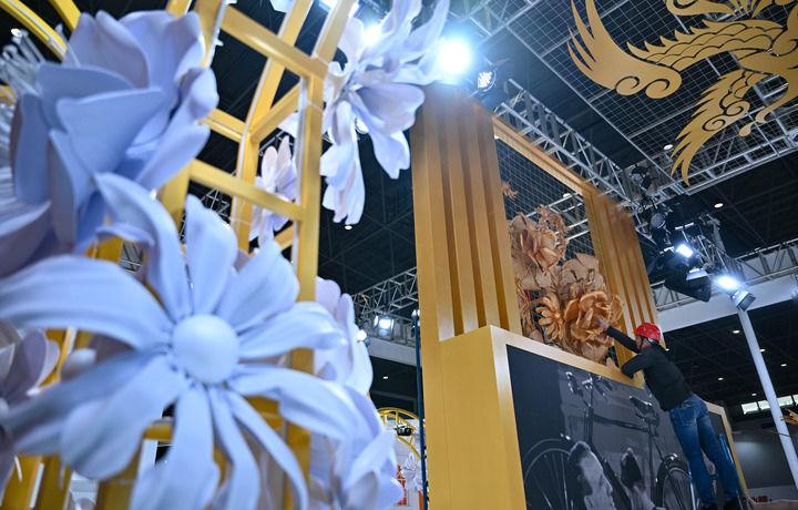 4月10日,展商在消博会主场馆布展。 新华社记者 郭程 摄