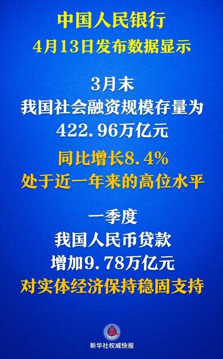 新华社北京4月13日电,金融是经济的镜像,反映着实体经济的需求。13日中国人民银行发布了主要金融数据,首季社会融资规模增量超15万亿元、新增贷款9.78万亿元、3月末广义货币M2余额同比增长7%……一个个数据展现着金融对实体经济保持稳固支持,也折射出实体经济需求持续回暖。