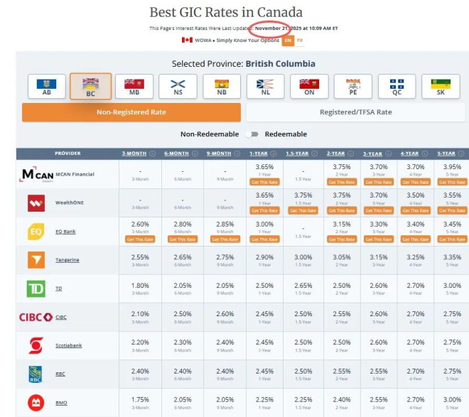 BC省最好的GIC利率如下: