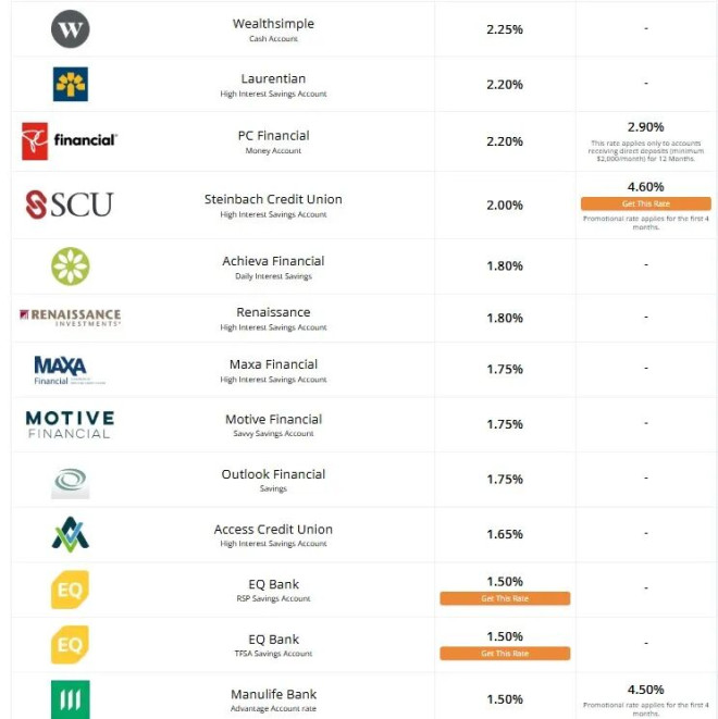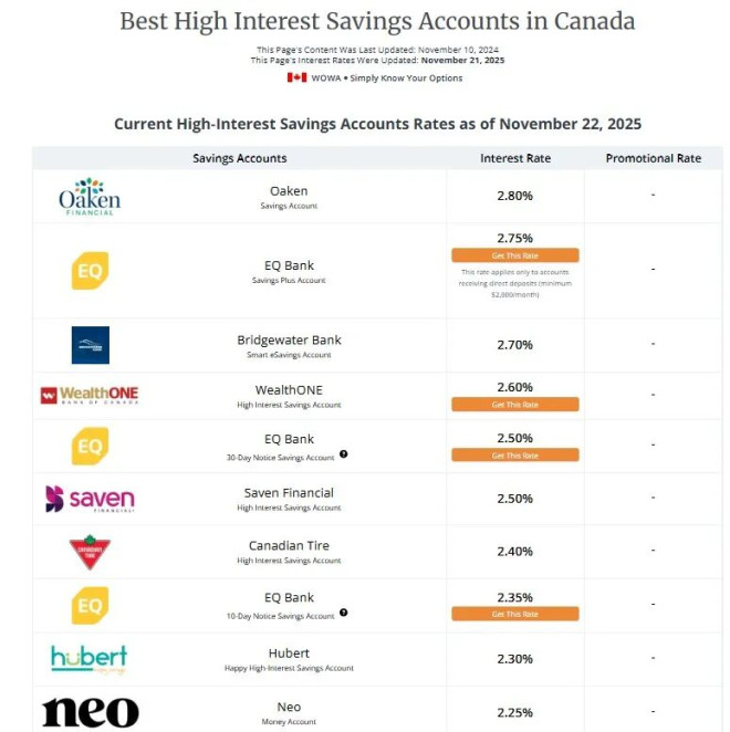 在无优惠活动的高息储蓄账户中,目前利率最高的是 Oaken Financial 的 2.80%。其次是 EQ Bank 的 2.75%,但需每月存入 2,000 加元才能享有。