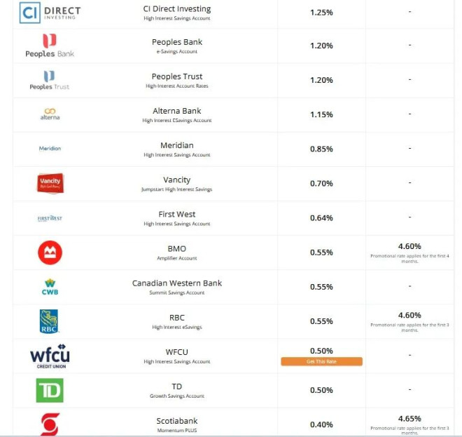 加拿大最佳高息储蓄账户如下: