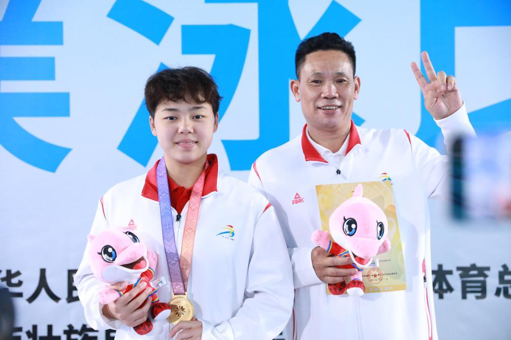 广西南宁市队姚华莉(左)超蹼泳女子100米器泳和50米潜泳两项世界青年纪录。赛事组委会供图