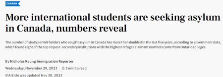 报道称,国际学生的人数增长主要是在公立和私立的学院(college),因为学院课程比大学提供的课程更便宜,时间更短,又可以让学生有机会留在加拿大工作,并在某些情况下有资格获得永久居留权。庇护数据显示,申请难民人数最多的前10所高等院校中,有8所是来自安省。