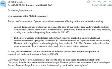在昨日(12月14日)魁省政府正式决定提高外省和外国学生的学费,并提出了新的法语要求,随后不久,麦吉尔大学校长向全体师生发了一封千字长信,以下是全文以及魁北客小编提供的中文翻译: