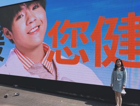 中国移民Vicky Lei在香港与MIRROR广告合照。受访者提供