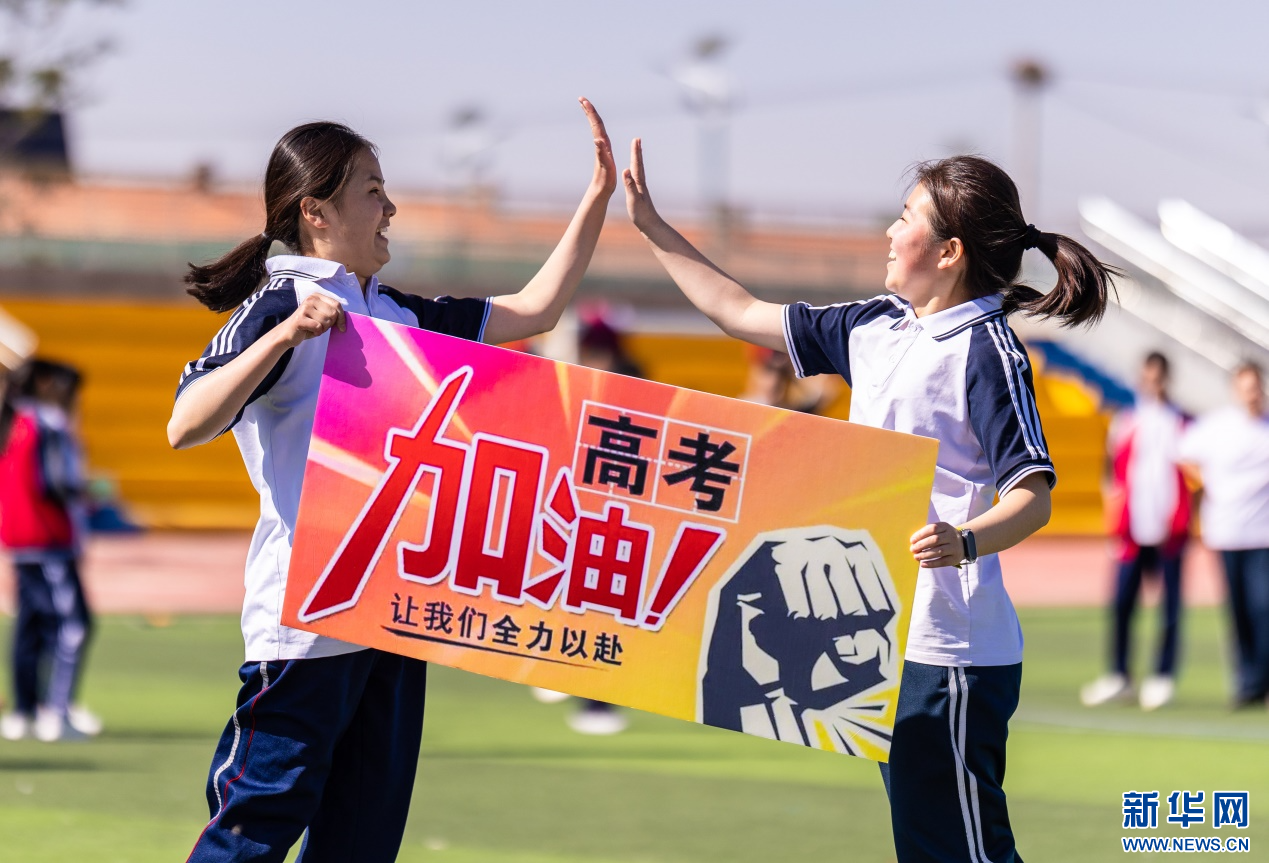 5月13日,呼和浩特市第十二中学高三学生在操场上做减压游戏。新华网发(丁根厚 摄)