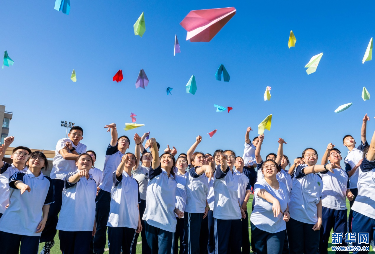 5月13日,呼和浩特市第十二中学高三学生在操场上放飞写有自己心愿的纸飞机。新华网发(丁根厚 摄)