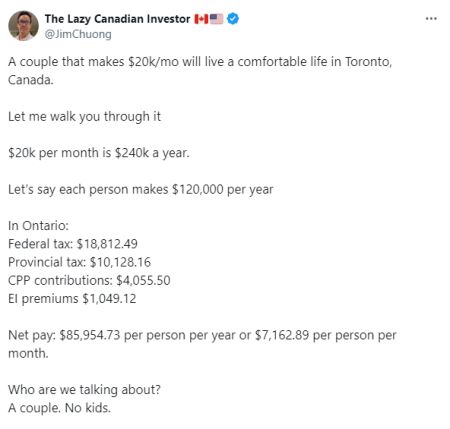 他在4月3日一篇谈论多伦多生活成本问题的帖子获得关注,至今已有160万人浏览过。在文中,他清晰地算了一笔账,并表示,一对没有养育孩子的夫妇需要月入20,000加元才能在加拿大多伦多将过上舒适的生活,这相当于两人一年收入要240,000加元。