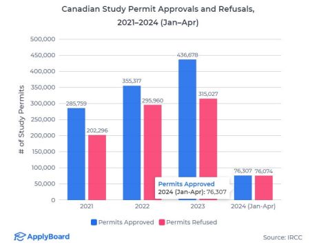 ApplyBoard在周三(6月19日)的一份报告中引用了加拿大移民、难民和公民事务部(IRCC)的数据称,如果今年前四个月的申请数量和批准率保持不变,获批的学习许可数量可能会降至229,000个。这比去年批准的436,678个许可减少了48%。