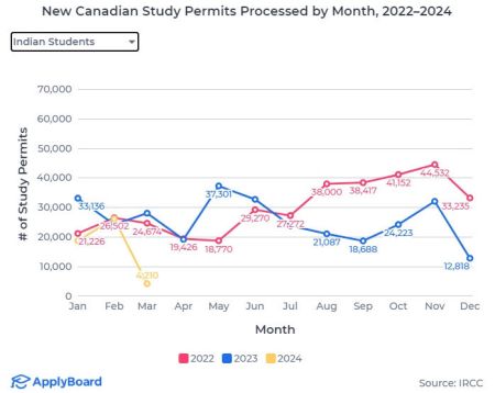 在2024年1月和2月,IRCC处理了近45,000份印度学生的学习许可申请。然而,在2024年3月,IRCC只处理了4,210份印度学生的学习许可申请。与去年3月的28073人相比,暴减了86%,这一数字急剧下降“可能是新来的学生人口结构变化的第一个迹象,”ApplyBoard表示。