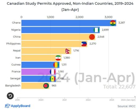 第一季度,除了印度学生以外,批准数量最多的是加纳(3267)、尼日利亚(2699)、中国(2546)、菲律宾(2270)、尼泊尔(1716)、伊朗(1380)、几内亚(1311)、法国(1190)、塞内加尔(1188)、孟加拉(965)。