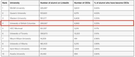 麦基尔大学名列加拿大大学第一名。在 LinkedIn 上的 225,497 名校友中,4.25%(9,603 人)成为了执行长。一些后来成为杰出商业领袖的麦吉尔著名校友包括 Telus 执行长 Darren Entwistle 和 Premier Inc. 前执行长 Susan DeVore。女王大学排名第二,其 153,620 名校友中有 4.02% 被列为执行长。西部大学排名第三,其 191,077 名校友中的 3.35% 获得了领导头衔。BC大学第四名,多伦多大学第六名。