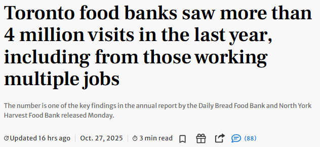 多伦多的食物银行危机正持续加剧——不仅低收入群体,就连多份工作或拥有高等学历的人,也不得不求助食物银行维持生活。这是Daily Bread食物银行与北约克丰收食物银行最新发布的年度报告《谁在挨饿》(Who’s Hungry)显示的现实,揭示了城市食品不安全和贫困问题的深层困境。