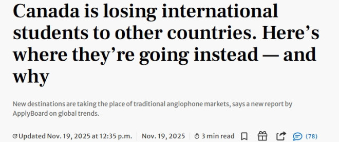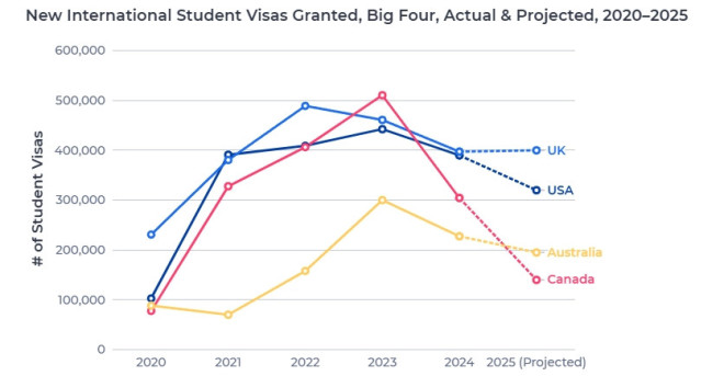 过去两年,加拿大大幅削减国际学生招生数量,其高等教育部门面临赤字、裁员和项目取消等压力。短期内,加拿大可能即便想恢复也难以重回过去。报告指出,在2025年,被称为“留学四大目的地”的加拿大、澳大利亚、英国和美国,都因为本国住房与生活成本压力继续控制国际招生数量。
