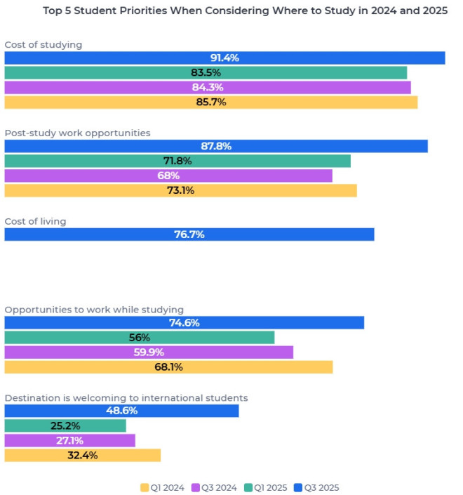 在前五大关键因素中,有四项与经济直接相关:学费成本、生活成本、能否在学习期间工作、以及毕业后的就业机会。尤其是“学习成本”,超过九成的合作伙伴表示,这是影响学生做出留学选择的首要决定性因素。