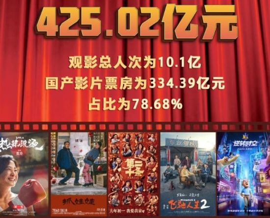 国家电影局1日发布数据,中国2024年电影总票房达425.02亿元,观影总人次为10.1亿。其中,国产影片票房为334.39亿元,占比为78.68%。