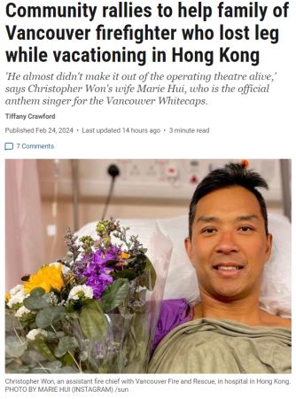 加拿大温哥华消防局(Vancouver Fire Rescue Services)助理局长Christopher Won在一次家庭度假期间突然感染罕见细菌,不得不紧急进行截肢,一家四口被困在香港,令温哥华社区感到揪心。